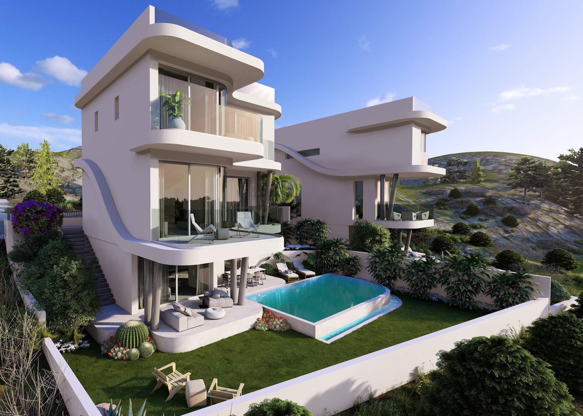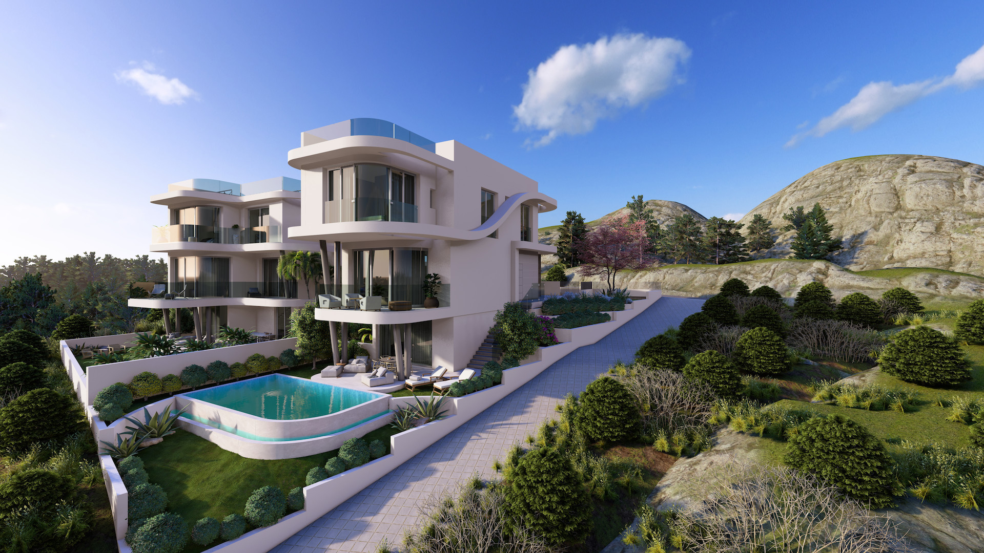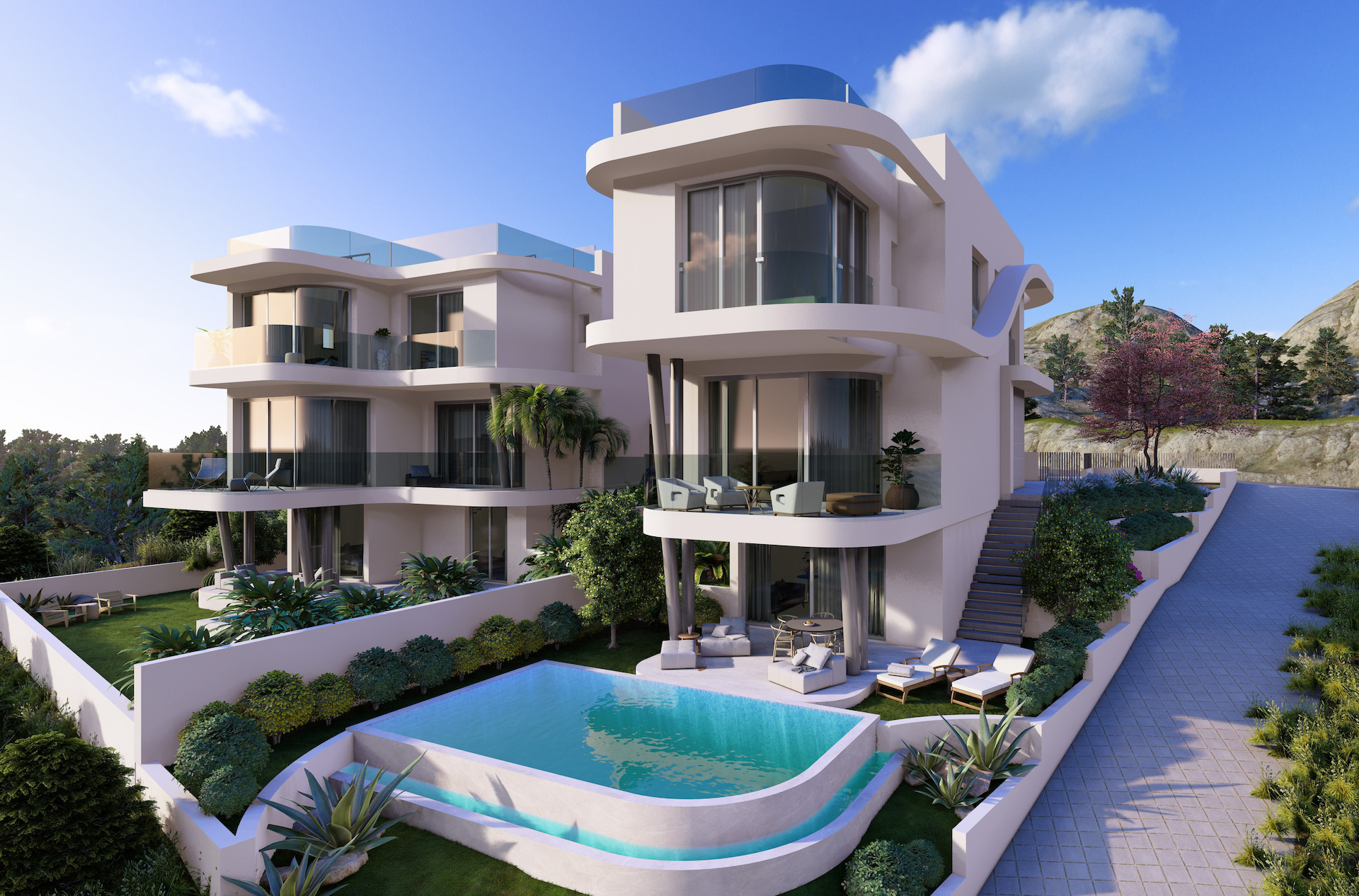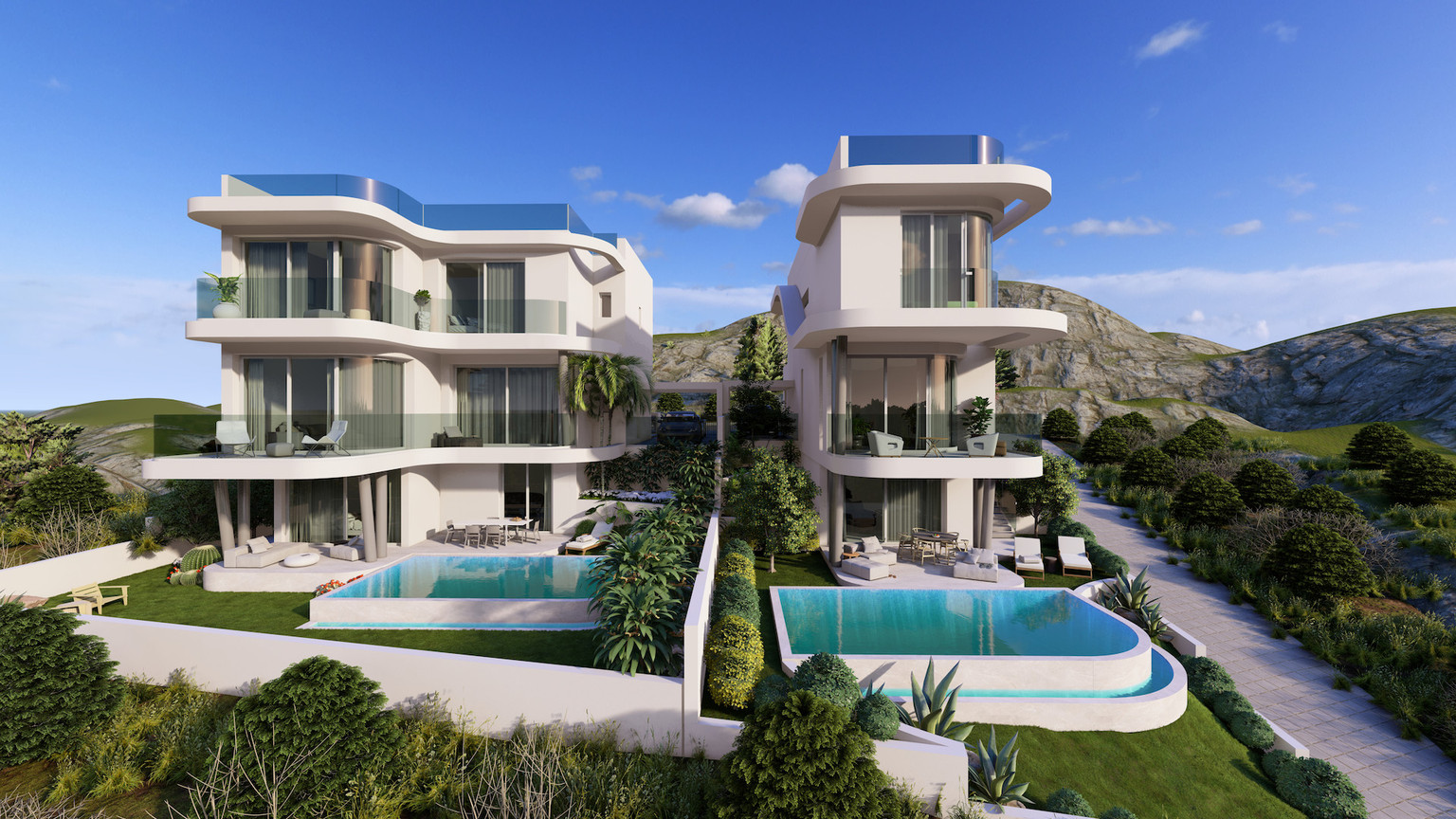 For sale luxury three-bedroom houses in the sought-after area of Agios Athanasios. This houses provide a comfortable living space with an open-plan kitchen and living room, three spacious bedrooms, two bathrooms, and a pool.